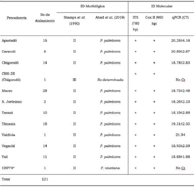 La amplificación de las regiones ITS y Cox II, permitió la identificación de los 120 aislados como pertenecientes al género Phytop hthora. Al evaluar los valores Ct en la qPCR para los diferentes aislados, se pudo establecer que 119 cepas resultaron positivas para la especie P. palmivora, con valores que oscilan entre 13.51 y 28.9, con un valor promedio de 19. De esta manera se corrobora lo encontrado en la caracterización morfológica. Tanto la cepa CH6-3S, como la cepa CNP79 (P. nicotianae) no cruzaron el umbral de ciclo, por tanto fueron consideradas negativas para P. palmivora (Tabla 4).