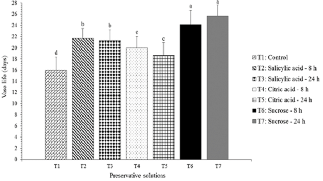 Floral senescence is influenced by several factors such as water stress, depletion of carbohydrates, micro-organisms, and ethylene effects (Sereket al., 2006). In order to delay the floral senescence, preservative solutions are used in postharvest to increase the vase life of cut flowers by improving the distribution of assimilates, water regulation, protection of floral scape in front of microbial agents, and reducing the ethylene effect (Ahmad et al., 2014).