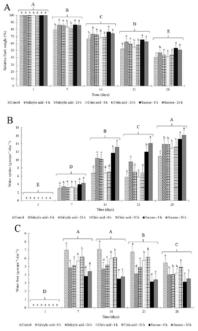 Water loss (WL) of V. incurvata floral scapes during the first 14 days of vase life was similar, decreasing during the postharvest period, with better results with the use of sucrose, followed by salicylic acid and citric acid (Figure 2C).