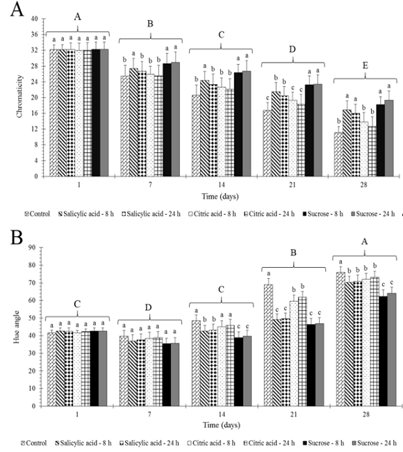 Considering that the sucrose solutions were similar in the two application periods (8 or 24 h), it is recommended to use for 8 h. This will favor the product postharvest operational management and the logistics distribution (Junqueira & Peetz, 2011).