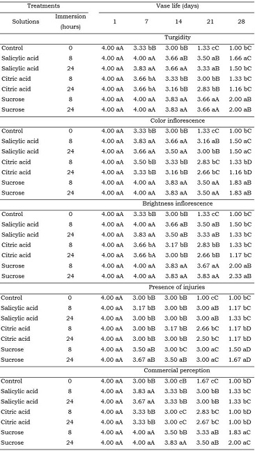 This experiment was conducted in a completely randomized design, in a factorial scheme composed of six postharvest treatments plus the control and five evaluation dates (1, 7, 14, 21, and 28 days). For each combination of factors, six repetitions were used, each one conformed by a floral scape for each vase.