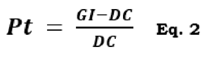 Efficiency was analyzed following Forero et al. (2013) who, in addition to economic efficiency, consider the technical profitability of the crop, net profitability, and technical efficiency. Technical profitability was determined by establishing the relationship between the difference in gross income and direct costs. For net profitability, the difference between gross income and direct and indirect costs was related to the total costs. The difference between gross income and direct cost was related to the cultivated area to calculate the technical efficiency of the crop. The technical profitability indicator was calculated establishing the relationship between the difference between gross income and direct costs, as follows: