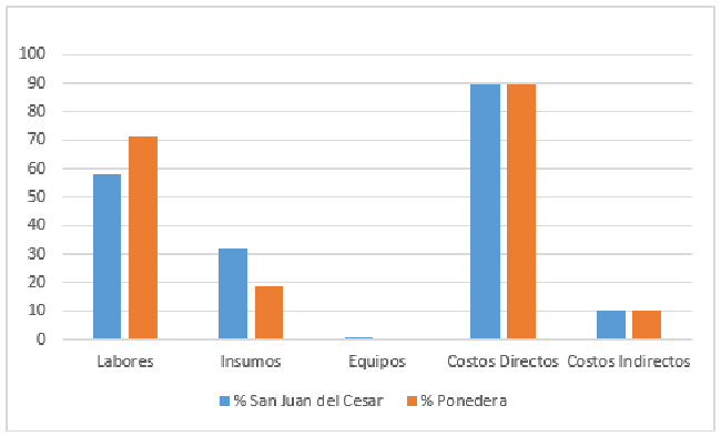 The differences concerning the participation of the labor share of 13 % between both localities can be observed with higher participation of this component in the case of Ponedera. These cost structures share the direct costs and differ in the participation of agronomic management work. Regarding inputs participation, the situation is inverse: the highest proportion is found in San Juan del Cesar with a difference of 13 % compared to Ponedera.