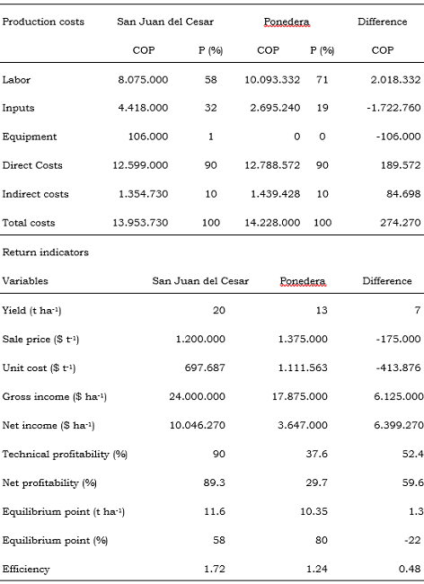 With the cost patterns for one hectare, a comparative analysis of the different elements involved in the production was carried out and can be observed in Table 1. This table shows that the net income is higher in San Juan del Cesar. This is explained by the difference in yields, obtaining a higher yield of 20 t ha-1 in this locality compared to Ponedera, that attained a value of only 13 t ha-1. This makes the profitability also higher in San Juan del Cesar.
