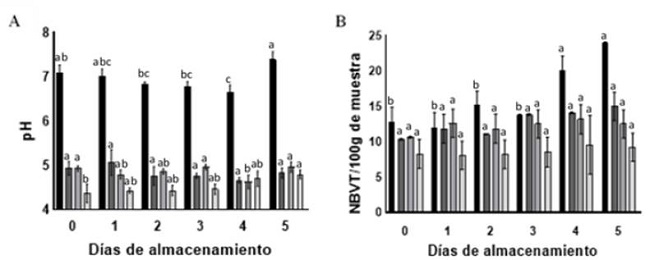 El pH de la muestra control no se modificó entre el primer y último día del período, aunque al cuarto día presentó una disminución significativa y aumentó nuevamente al quinto día de almacenamiento, coincidiendo con lo encontrado en Pacú almacenado en hielo (Borges et al., 2014). Estas fluctuaciones del pH pueden deberse a que, durante el proceso de deterioro del pescado, la concentración de iones de hidrógeno varía por la descomposición hidrolítica, oxidación o fermentación del músculo (Boziaris y Parlapani, 2017).