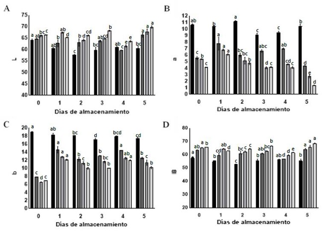 Al evaluar estos parámetros de color, en conjunto en el cálculo del IB, es posible inferir que las muestras impregnadas presentaron valores significativamente mayores a la muestra control, lo que indica que el tratamiento modificó el CS de la carne de pescado, tornándola más clara, lo cual se mantuvo durante el tiempo de almacenamiento estudiado (Figura 2D).