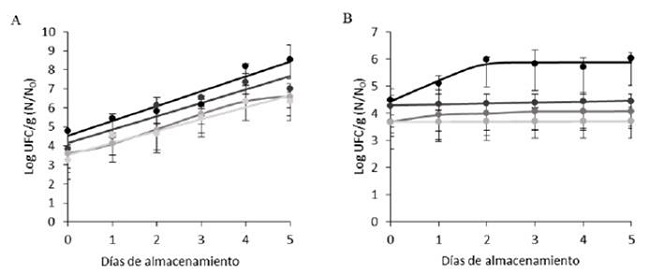 Se muestra el efecto del tratamiento de impregnación y el envasado a vacío sobre el crecimiento de bacterias psicrótrofas (A) y bacterias proteolíticas (B) en muestras control (•) y muestras impregnadas 5 (•), 10 (•) y 15 (•) minutos. Las líneas corresponden a las curvas modeladas utilizando Programa ComBase Predictor.