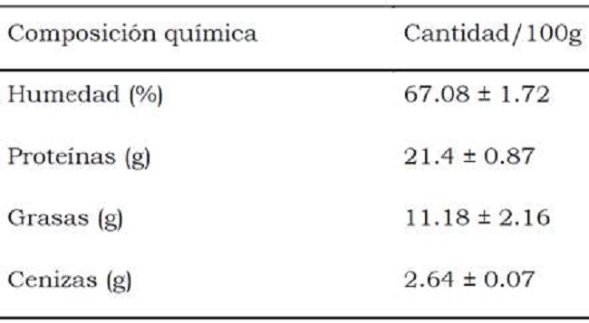 En la Tabla 1 se presenta el contenido de humedad, proteínas, grasa total y cenizas cada 100 g de carne de boga fresca.