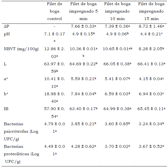 El proceso de impregnación ocasiona la disminución de los valores de a* y b* y el aumento de L*, tornando más blanquecino el aspecto de la carne de pescado. El IB mostró que el tratamiento de impregnación ocasiona un aumento significativo en la blancura de la superficie de las muestras (Tabla 3).