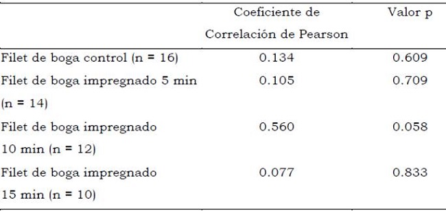 La impregnación a vacío durante 5 y 10 minutos no produjo cambios significativos en el NBVT, en cambio, cuando el proceso de impregnación se realizó durante 15 minutos, se produjo la disminución del contenido NBVT (Tabla 3). Estos resultados, tanto de muestras impregnadas como control, mostraron valores correspondientes a carne de pescado fresca.