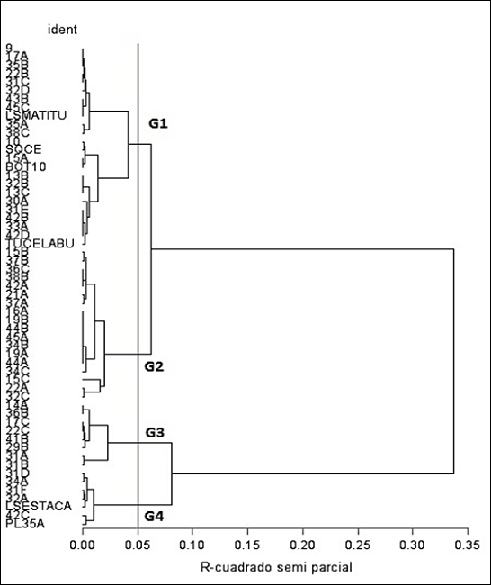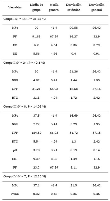 Según el análisis de clasificación se identifican cuatro grupos (Tabla 2 y Figura 1). En el grupo 1 se encuentran 24 introducciones, que corresponden al 42.1 % de la población evaluada. Este grupo presenta el promedio más alto de MFo con un 60.0 ± 26.42%, en comparación con el promedio general de 41.40 ± 26.42%. Además, presentó los promedios más bajos para NRP (4.82 ± 1.95), NFP (31.2 1 ± 57.15) y RTO (3.13 ± 2.42 t ha-1) (Tabla 3 y Figura 1).