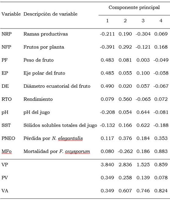 El primer CP explica el 34.9 % de la varianza total y tiene asociaciones positivas altas con PF (0.483), EP (0.485) y DE (0.49) que son las variables que determinan características físicas del fruto, lo cual es esperado y explicable. El segundo CP explica el 25.8 % de la varianza y está relacionado con el RTO, dado que tiene asociaciones altas y positivas con el PNEO (0.376) y RTO (0.56). El tercer componente está relacionado con variables de calidad del jugo de fruto con asociaciones altas y positivas con los SST (0.622) y el pH (0.644) y con un aporte del 13.9 % a la varianza total. El cuarto componente relacionado con la mortalidad por F. oxysporum explica el 7.8% de la varianza total y tiene una asociación negativa con el RTO (-0.31) (Tabla 1).