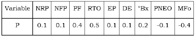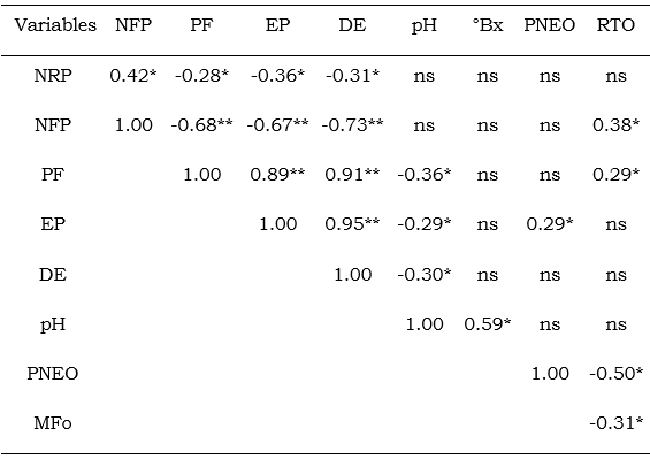 En cuando a PNEO, la Tabla 3 muestra que 30A, 31C, 32A y SQCE no registraron pérdidas por el pasador del fruto. Sin embargo, las perdidas por esta plaga son considerables, si se observa la correlación negativa significativa con el RTO (r = -0.5*) (Tabla 4). Gómez et al. (2013) y Carmona et al. (2006) determinaron que las larvas pueden causar mermas económicas hasta de un 90 %, dado que su alimentación se centra en la pulpa del fruto durante un periodo de incubación de 14 a 25 días, lo que genera la caída de los frutos atacados. En este sentido, las PNEO en el 92.98 % de la población fue de 0.51 ± 0.6 t ha-1 con valores mínimo y máximo de 0.04 y 3.05 t ha-1, respectivamente.