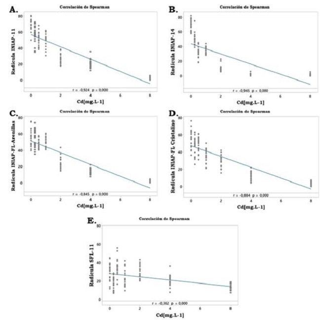 Con respecto al crecimiento inicial de las plántulas el parámetro más afectado fue la longitud de las radículas donde se observó una fuerte correlación inversamente proporcional entre la concentración de Cd y la longitud de las radículas en las variedades ‘INIAP-11’ (rs= -0.924; P = 0.000), ‘INIAP-14’ (rs= -0.945; P = 0.000), ‘INIAP FL-Arenillas’ (rs= -0.845; P =0.000) e ‘INIAP FL-Cristalino’ (rs= -0.884; P = 0.000). La única variedad donde se apreció una baja correlación entre el crecimiento y la concentración de Cd fue en ‘SFL-011’ que demostró ser la variedad más tolerante a este metal (rs= -0.362; P =0.000) (Figura 1).