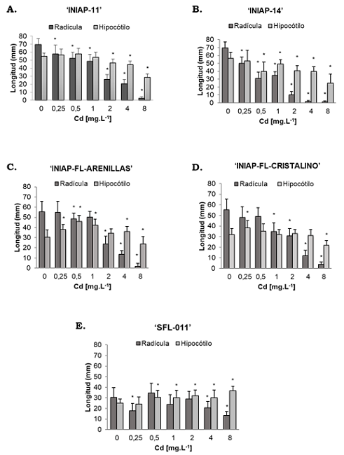 Por otro lado, la variedad ‘INIAP-FL-Cristalino’ presentó una disminución de la longitud de las radículas a partir de 1 mg.L-1 Cd (Figura 2D). A la mayor concentración del metal pesado la longitud de la radícula fue de 3.81 ± 2.2 mm, significativamente menor a su control 55.36 ± 10.22 mm (P = 0.000).