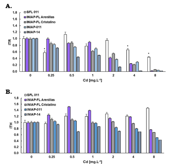 En general la tolerancia al cadmio representada por el índice de tolerancia de los hipocótilos (ITH) se presentó en el orden ‘SFL-011’ > ‘INIAP-FL-Arenilla’ > ‘INIAP-FL-Cristalino’ > ‘INIAP-11’ > ‘INIAP-14’. El ITH mostró un estímulo de crecimiento inicial reflejado en valores mayores a uno en la variedad ‘SFL-011’ a las concentraciones de Cd: 0.5(1.13), 1(1.2), 2(1.28), 4(1.21) y 8(1.47) mg.L-1, lo que refleja una alta tolerancia al Cd en esta variedad. De igual manera, la variedad ‘INIAP-FL-Arenillas’ mostró una alta tolerancia en los hipocótilos de 0.25-4 mg.L-1 de Cd y se redujo a 8 mg.L-1 (0.77) y la variedad menos tolerante fue ‘INIAP-14’ cuyos valores se redujeron al incrementar la concentración de Cd desde 0.93 a 0.25 mg.L-1 Cd hasta 0.43 a 8 mg.L-1 de Cd.
