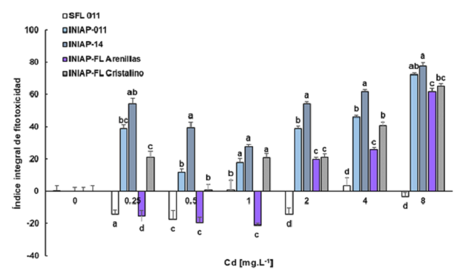 Con respecto al índice integral de fitotoxicidad las variedades más tolerantes fueron ‘SFL-011’ e ‘INIAP-FL-Arenillas’ (Figura 4). La variedad ‘SFL-11’ mostró un estímulo de crecimiento inicial reflejado por su valor negativo a las concentraciones 0.5(-17.44), 2(-14.38) y 8(-3.33) mg.L-1 lo que refleja la tolerancia de esta variedad al Cd. De igual manera, ‘INIAP-FL-Arenilla’ presentó un estímulo de crecimiento a 0.25(-15.41), 0.5(-19.69) y 1(-21.2) mg.L-1 de Cd.