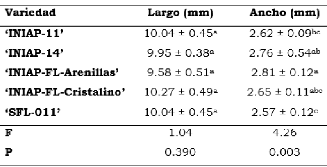 La Tabla 1 muestra las dimensiones del largo y ancho de las semillas para cada variedad. En la Tabla 2 se resumen las propiedades de cada variedad de arroz en cuanto a su origen, rendimiento, y tolerancia a diversas plagas en Ecuador.