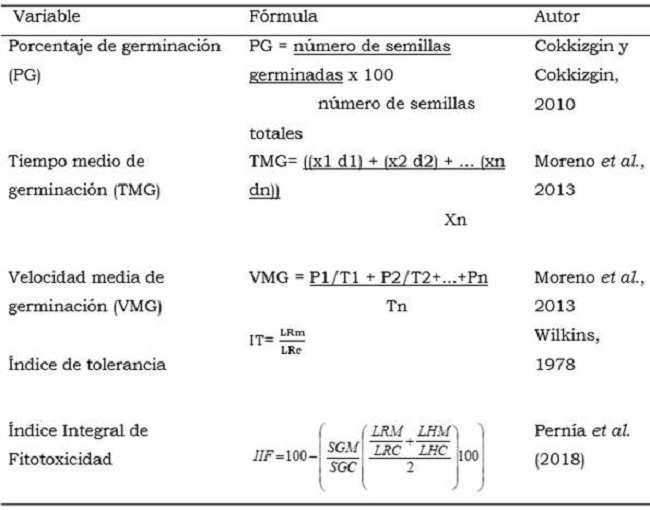 El porcentaje de germinación, el tiempo medio de germinación (TMG), la velocidad media de germinación (VMG), el índice de tolerancia (IT) y el índice integral de fitotoxicidad se calcularon utilizando las fórmulas que se muestran en la Tabla 3.