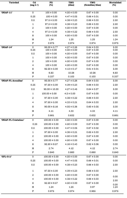 Las variedades más tolerantes al metal pesado fueron ‘SFL-011’ e ‘INIAP-Arenillas’ y las menos tolerantes ‘INIAP-11’ e ‘INIAP-14’.