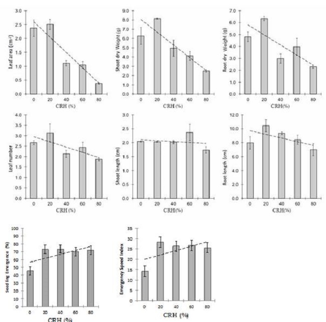 From (Figure 1) it was observed that, in general, the increase of CRH in the mixture with BCS tended to reduce the mean values of the variables measured in the seedlings from 20 %. Shoot length and root length were not affected by the treatments, while leaf area, leaf number, seedling emergence, emergency speed index, and shoot and root dry weight showed a significant response to the addition of CRH to the substrate.