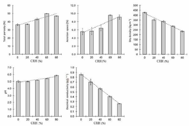 The CRH addition to BCS significantly affected all physical and chemical characteristics of the evaluated substrates (Figure 2 and Table 2). Total porosity, aeration space, and pH increased their mean values as substrate CRH increased while dry density and electrical conductivity were reduced.