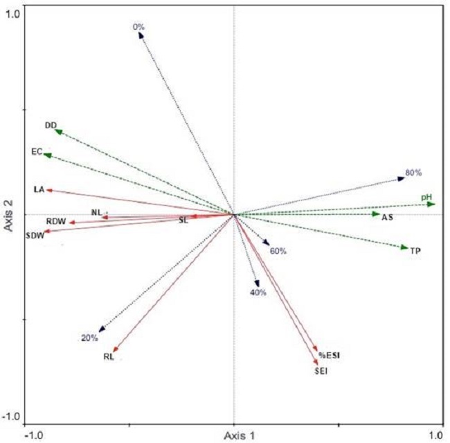 Redundancy analysis was performed to identify the variables that best explain seedling responses to treatments (Figure 3). The weight variables (NL, LA, SDW, and RDW) were strongly correlated with each other and positively. The % SEI and SEI are also positively correlated, but the angle of their arrows is almost 90° with the other variables, indicating that they are poorly correlated with the others, that is, how much or how much higher the SEI emerges does not affect the LA, NL or SDW.