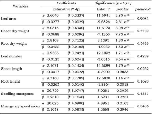 The regression results performed comparing different proportions of carbonized rice husk in the substrate and the basil seedling dry weight variables measurements are presented in Table 1. Leaf area and shoot dry weight were affected by treatments (p-value = 2.61 e-07 and 7.75e-06) and presented the best adjustments of the model (pseudo R2 = 0.9081 and 0.7780, respectively). In other words, 90.8 % of variations in leaf area and 77.8 % of variations in shoot dry weight occurred due to the change in the proportion of carbonized rice husk in the substrate. Unlike variables such as root dry mass, number of leaves, shoot length, root length, emergence percentage, and emergence speed index (p-value: 1.50e-03, 9.64e-03, 0.5653, 0.0818, 0.2251, 0.2946 epseudoR²: 0.5429, 0.4289, 0.0262, 0.1620, 0.4361, 0.3486).