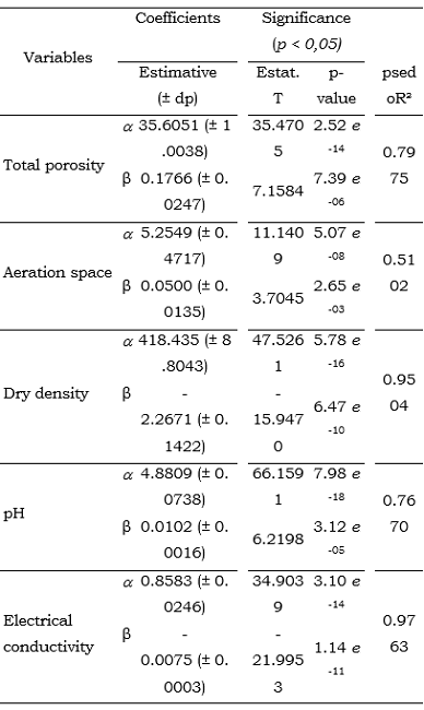 As the dry density increased to values close to 350 kg m-3, there was an increase in the leaf area and shoot dry weight. This can be explained by the simple fact that with the increase in density, there is a reduction in total porosity and space. aeration (Figure 2), leading to low exposure of the root system to the desiccant air effect (oxidation) that impairs its development, for beneficial effects such as high seed germination due to increased contact between seed and substrate, formation of secondary roots capable of exploiting larger substrate volume (Libardi, 2005; Steffen et al. 2010).