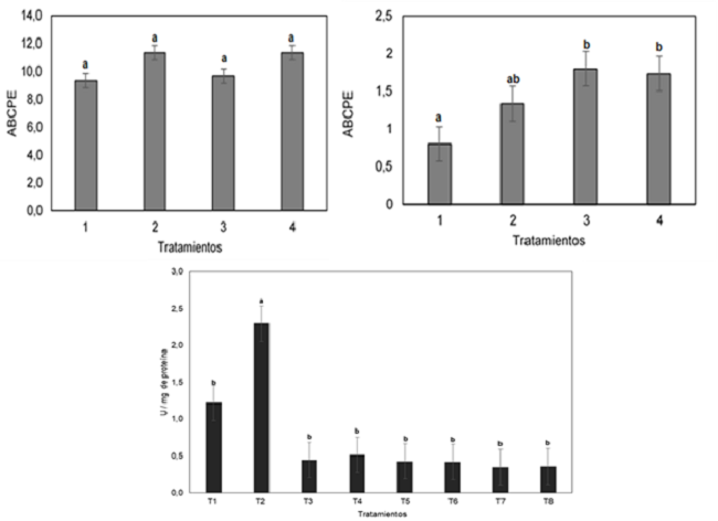 La actividad enzimática evaluada a los 60 días después de la inoculación fue mayor en los tratamientos T1 (silicio +T. viride+ patógeno) y T2 (silicio - T. viride+ patógeno) en comparación con los demás tratamientos. La mayor actividad en los tratamientos con silicio e inoculados con el patógeno (T1 y T2) puede ser atribuida a la capacidad del agente inductor para activar los mecanismos de defensa en la planta incluida la actividad de la Polifenoloxidasa (PPO). (Figura 1).