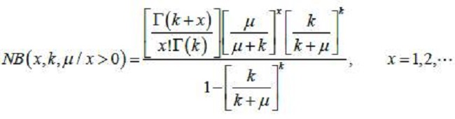 Dado el comportamiento frecuentista del número de días con lluvia, el cual es de cola larga, se ajustó a un modelo binomial negativo. Además, como la mínima racha de lluvia es un día, se utilizó el modelo binomial negativo truncado en cero derivado de la siguiente forma: