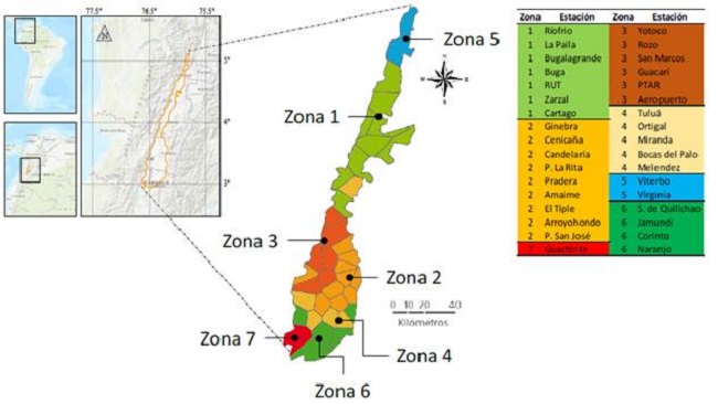 De acuerdo con Cortés et al. (2019), en la región productora de caña de azúcar del valle del río cauca se identifican siete zonas climáticas (Figura 1). En la definición de las zonas se tuvo en cuenta la precipitación acumulada y otras variables meteorológicas diferentes a la lluvia, por lo que la zonificación define sitios con características climáticas diferentes que podrían afectar la producción potencial de cultivos en la región. Dado que dicha zonificación es la herramienta para tomar varias decisiones que involucran clima y manejo del cultivo, este estudio se centra en ese antecedente. Es decir, el análisis es a escala de zona climática.