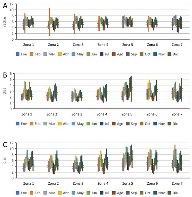 En las zonas climáticas 1, 5, 6, y 7, por ejemplo, el número medio de rachas por mes varía poco a través del año. En dichas zonas, son comunes 5 a 6 rachas por mes (Figura 3a), variando la duración media de la racha a través de los meses. El mayor número medio de días por racha se observa en las épocas lluviosas y lo contrario en las épocas secas (o menos lluviosas) (Figura 3b). En las otras zonas climáticas (2, 3 y 4), varían tanto el número de rachas, como el número medio de días por racha (Figura 3). En las zonas 2, 3 y 4 es normal encontrar que el número de rachas y la longitud media de la racha es menor en épocas secas (o menos lluviosas) en comparación con las épocas lluviosas, cuando ambas variables tienden a ser mayores.