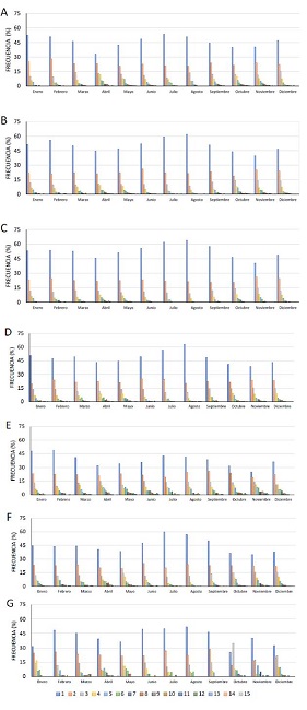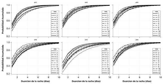 En términos de frecuencia, y en forma generalizada para todas las zonas climáticas, los meses en los que se esperaría tener rachas de mayor longitud serían abril, mayo, octubre, noviembre y diciembre. Vale la pena mencionar que la reducción en la frecuencia de rachas de longitud uno (1 día), no representa necesariamente un incremento en la frecuencia de algún otro tipo de evento en particular. Como característica especial, en las tres zonas más lluviosas de la región (zonas 5, 6 y 7) la diferencia entre la frecuencia de rachas de un día y de dos días es más baja que en las otras zonas climáticas, concretamente durante los meses lluviosos (Figuras 5e, 5f, 5g).