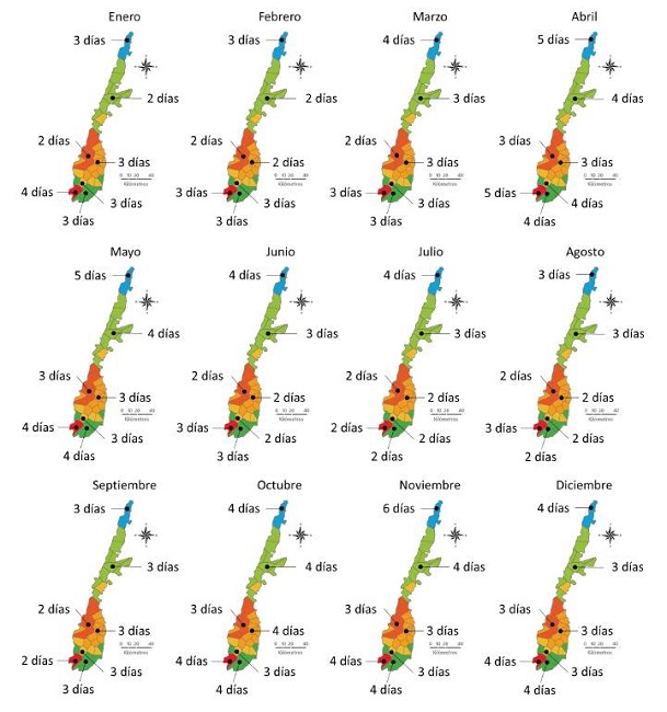 Esta información es suficiente para planificar cultivos a escala de año y de mes; de hecho, con base en aquella información se determina, desde las épocas en las que se cosechará mayormente bajo el esquema semi mecanizado, las fechas de preparación de suelos para nuevas siembras (plantillas), hasta las épocas para el mantenimiento de las fábricas (ingenios). Específicamente, en el norte y en el sur del valle del río Cauca, ciertas actividades deberían concentrarse más, dado que las épocas secas tienen menor duración en comparación con lo que ocurre en otras zonas (Figura 2). Sin embargo, para la planificación semanal de actividades esta información puede ser insuficiente.