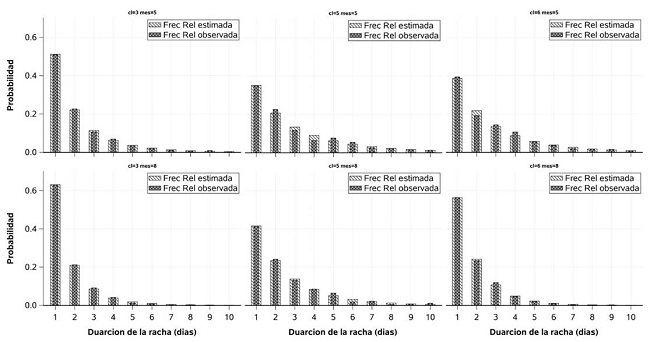 (Ec. 7)Siendo la ecuación (8) la probabilidad de llover más de x días dado que ya llovió más de x0 días. El cálculo de estas probabilidades permite aproximar una de la racha de lluvia asociada a una probabilidad de ocurrencia. En este trabajo se muestran la duración de la racha en días mientras que la probabilidad de la ecuación (8) sea mayor a 1 %, 5 %, 10 %, 25 %, 40 % y 60 %.
