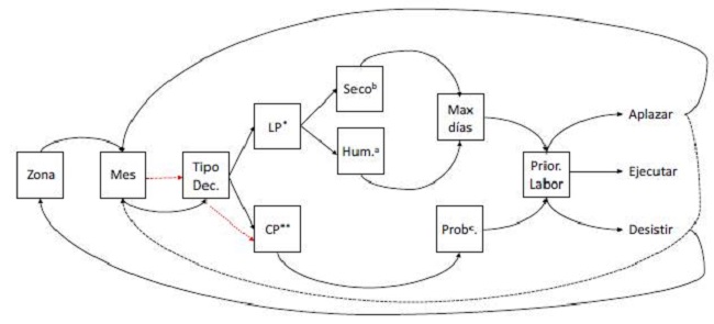 Finalmente, puede decidir aplazar la realización de la labor para otro momento del mes de abril en el que esta pueda realizarse. En ese caso, con base en la Ecuación 8, el decisor puede definir, teniendo en cuenta la condición del momento, la probabilidad de que el comportamiento de la lluvia cambie o se mantenga en los siguientes días (Tabla 4). En este caso, la condición del momento se refiere al número de días lluviosos consecutivos ocurridos hasta el momento. Con base en la ecuación ya referenciada (Ecuación 8), se puede determinar la probabilidad de que haya n número de días más con lluvia dado que ya llovieron n días consecutivos (Tabla 4). Después de dicha consulta, el abanico de decisiones es el mismo que el del ejemplo anterior (Figura 8). La Tabla 5 muestra las probabilidades de ocurrencia de diferentes eventos en un mes seco (agosto) en la misma zona (zona 6).