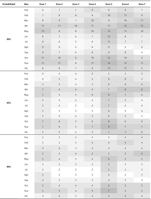 De acuerdo con el análisis anterior, queda expuesta claramente la condición inversa del ciclo anual de lluvias existente entre la zona lluviosa del norte (zona 5) y las zonas lluviosas del sur (zonas 6 y 7). Es decir, mientras en la zona 5 la máxima frecuencia de rachas de un día es alta únicamente durante enero y febrero, en las zonas 6 y 7 la máxima frecuencia de este tipo de evento se presenta entre julio y agosto, mostrando que las épocas secas importantes varían temporalmente entre norte y sur. Además, se observa que, con excepción de la zona climática 1, la menor frecuencia de rachas de longitud uno (1 día) se presenta de forma generalizada entre octubre y diciembre, mostrando una diferencia básica en el comportamiento de las dos temporadas lluviosas (Figura 4). Es decir, es posible que las labores mecanizadas se vean más interrumpidas durante la temporada lluviosa del segundo semestre, en comparación con las de la temporada lluviosa del primer semestre del año. En la zona climática 1, la menor frecuencia de este evento se presenta en abril. En la Figura 5 se describe la longitud de la racha asociada a una probabilidad empírica del 80 % (Frecuencia relativa de los histogramas).
