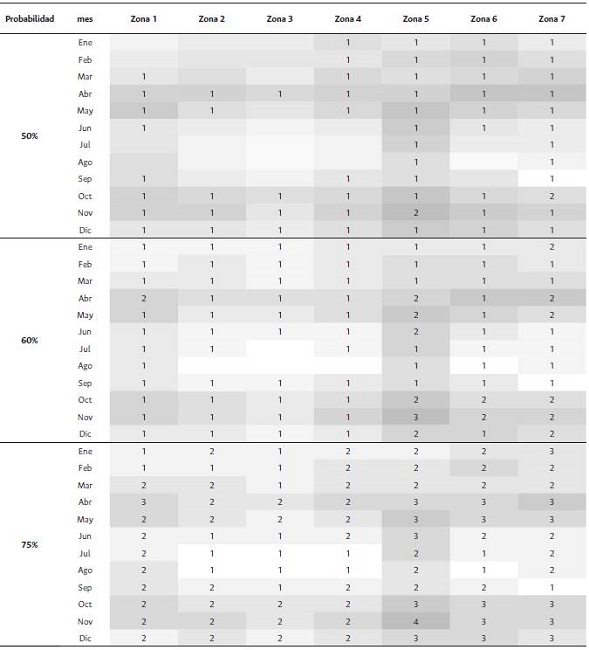 La aplicación del modelo binomial negativo en las labores y la logística mensual del cultivo de la caña de azúcar es inmediata en modelos de asignación, como los que se reportan en Guan et al. (2008) para diseñar planes de trabajo en haciendas. Dependiendo del tipo de suelo y la época del año es posible definir la fecha óptima de ejecución de una labor mecanizada. Por ejemplo, durante el mes de marzo, un tomador de decisiones ubicado en la zona climática 6 (sur del valle), que está planificando una labor para el mes de abril, y que está al tanto del contexto pluvial del momento (húmedo o seco) puede definir de mejor manera la oportunidad de realizar dicha labor (Figura 8). Con conocimiento del contexto pluvial se hace referencia a que, como definieron Peña et al. (2001) para la región, no todos los años son similares y se encuentran periodos más y menos húmedos. Es decir, en un periodo húmedo, como ocurre en la mayoría de los eventos La Niña en la región andina (Ramírez y Jaramillo, 2009), la racha puede ser de hasta 13 días en abril (Tabla 2).