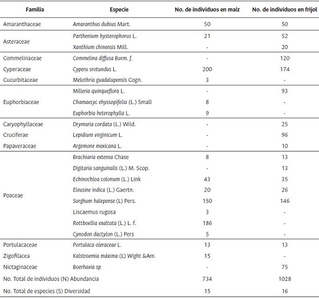 En el cultivo del frijol se registraron 11 familias y 16 especies (Tabla 1). Aunque hubo una mayor abundancia de arvenses dicotiledóneas, dominaron las monocotiledóneas C. rotundus y S. halepense; aquí, sin embargo, ambas fueron acompañadas en la dominancia por Commelina diffusa Burm. f. y Lepidium virginicum L., las cuales no aparecieron en el cultivo del maíz, cuya presencia parece estar ligada al cultivo del frijol y por tanto ser especies específicas acompañantes del cultivo.