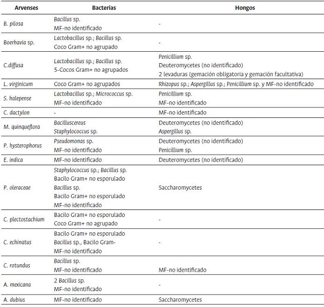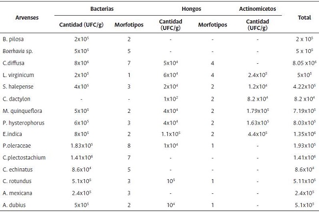 Las especies de arvenses que albergaron mayor presencia de bacterias fueron C. Plectostachium y C. diffusa mientras E. indica fue la principal para los hongos. El grupo de los actinomicetos, correspondieron a las especies L. virginicum, P. hysterophorus y E. indica.