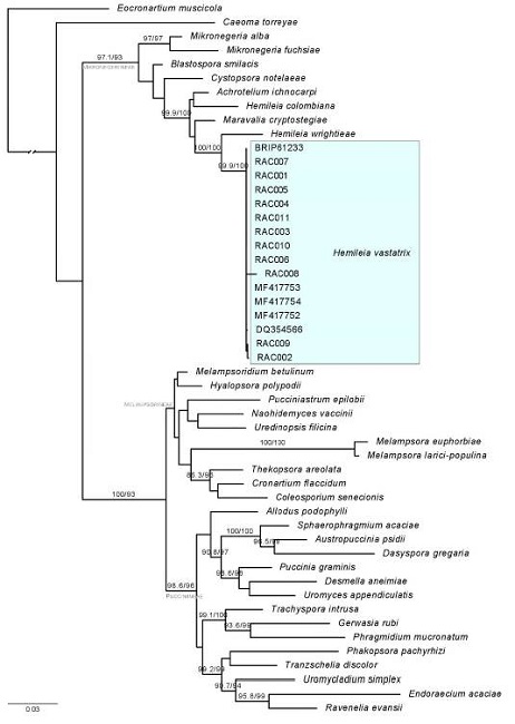 Sequences were assembled with CLC Genomics Workbench 7.0 (Qiagen®), deposited in GenBank, and aligned with sequences of rust fungi from the Mikronegeriaceae, including genera such as Achrotelium, Blastospora, Cystopsora, Hemileia, and Mikronegeria, and taxon sampling to include families recovered by Aime (2006) and McTaggart et al. (2016). We used available sequences of H. vastatrix in GenBank to provide a phylogenetic species hypothesis for the samples collected in Peru (Table 2). We aligned sequences using Guidance2 (Sela et al., 2015) and searched for the most likely tree with IQTree v.1.7 beta (Nguyen et al., 2015) with a model test (command-m TEST), 10.000 ultrafast bootstraps (Hoang et al., 2018) and a probability ratio test with approximately 10.000 replicates (Guindon et al., 2010).