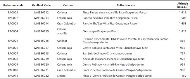 An average of 50 leaves from 10 coffee plants with typical symptoms of chlorotic lesions with presence of yellow uredospores at different stages of severity were collected from different cultivars in 11 locations in the departments of Pasco and Junin, during the period 2017 and 2018 (Table 1). The samples were transported in Ziploc bags to the Center for Plant Molecular Biology Research from Universidad Nacional del Centro del Perú. The collected leaves were observed with a stereomicroscope to eliminate contaminants and then the spores were collected in an eppendorf tube and stored at 4 °C for processing and later analysis. For morphological description, spores collected from all localities were observed with a Leica ICC50 W microscope. In addition, all specimens were registered in the Herbarium of Phytopathology of the Faculty of Agronomy of the Universidad Nacional del Centro del Perú.