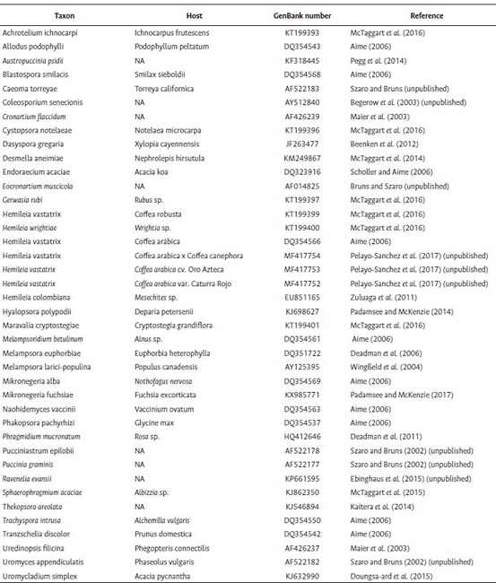 Research on the identity of fungi was traditionally based on approaches based on cultivation and observation of morphological characteristics; however, as these characteristics are variable, this induces inaccurate identification. Currently, identity studies based on nucleic acids are accurate and may even reveal new species (Hibbett et al., 2016; Tedersoo et al., 2018). Multiple regions of the ribosomal RNA genes have been used for studies of fungal taxonomy and genetic diversity; these include the small subunit (SSU), large subunit (LSU), and internal transcribed spacer (ITS) region that separate the two ribosomal genes (Vilgalys & Hester, 1990; White et al., 1990; Asemaninejad et al., 2016). The ITS region is more variable and has multiple copies, so it is difficult to align due to differences in the length of the amplicons obtained (Eberhardt, 2012; Talhinhas et al., 2017), whereas the LSU region contains two variable regions in length and structure called D1 and D2, which are bordered by highly preserved sequences in most fungi. This arrangement facilitates the alignment of the LSU region for phylogenetic analysis (Hibbett et al., 2016). There are several reports for the phylogenetic classification of rust using the LSU molecular marker (Aime, 2006; Zuluaga et al., 2011; McTaggart et al., 2016).