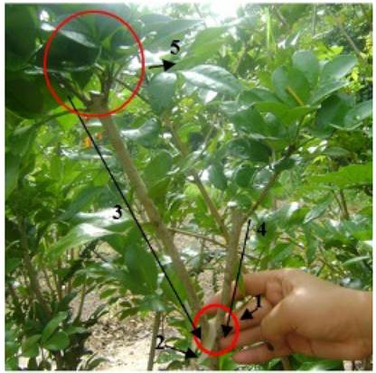 After the pruned branches had regenerated, pruning was performed again, this time only at 20 cm from the branch bifurcations that had regenerated. The parameters evaluated were the total number of shoots, total number of leaves per shoot, length of the biggest shoot, number of leaves of the biggest shoot, and regeneration time.