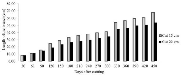 The length of the branch followed the leaves’ growth, with a progressive increase over the months, regardless the type of cut, having an initial mean growth of 8.23 cm and 8.24, and 53.8 cm, 53.8 in the end of the evaluation, at 20 cm and 10 cm cut, respectively (Figure 4).