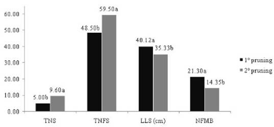 After pruning, the plants were evaluated every 30 days, and the parameters analyzed were: number of leaves per shoot and length of the biggest shoot.