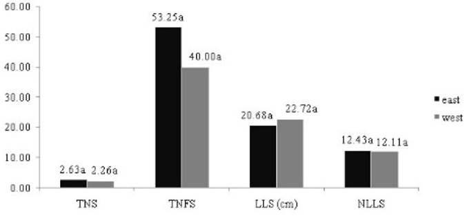 The mean number of shoots, total number of leaves per shoot, length, and number of leaves of the biggest shoot, under the influence of the east and west pruning directions are presented in Figure 5.