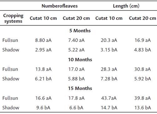 At five months after pruning there were no statistical differences for the parameters evaluated at both cutting (heights) distances (10 and 20 cm), as well as the number of leaves considering the cropping system (full sun and shade). However, there was a difference among the cropping systems for the shoot length of the branches. The plants cultivated under full sun obtained the highest means value (20.3 cm) at the 10 cm cut while the plants cultivated in the shade, at the same cutting height, had a lower mean length (3.15 cm) (Table 1).