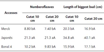 There was no significant difference between the cutting distances. However, there was a significant difference between the accessions for mean number of leaves and mean length of the biggest shoot. The highest mean number of leaves was obtained in the Japanês accession (21.3 cm) at 10 cm cut from the branch bifurcation, and the biggest mean length of the biggest shoot with 40.1 cm at 20 cm from the bifurcation. There were no significant differences between the Merck and Bonal 4 accessions in either parameter evaluated.